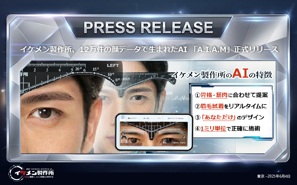 【東京・2025年6月4日】 メンズメイク専門店「イケメン製作所」を運営する株式会社オシアスター(代表取締役 CEO 手塚拓海)は、AIによって誤差1ミリのメンズメイクを可能にする独自開発の新技術「A.I.A.M(アイアム)」を正式リリースしました。