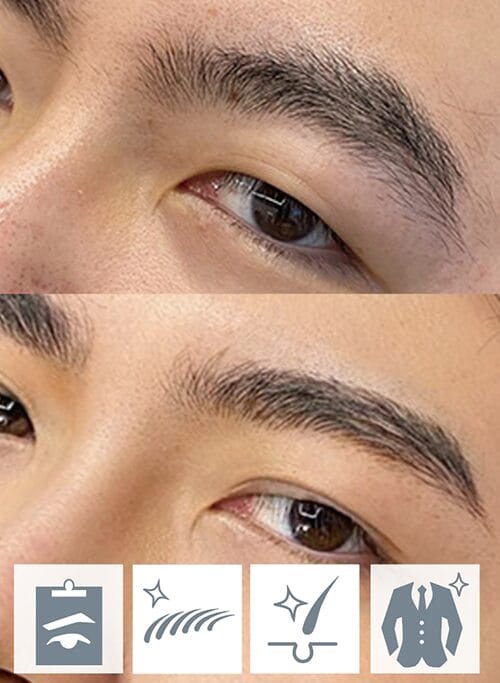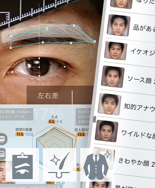 イケメン製作所のメンズ眉毛は、独自AIによる顔解析で骨格や筋肉のつき方を3Dスキャンで把握し、顔の構造や特徴に合わせて“あなただけの最適な眉毛”を1ミリ単位で設計するプロ施術。